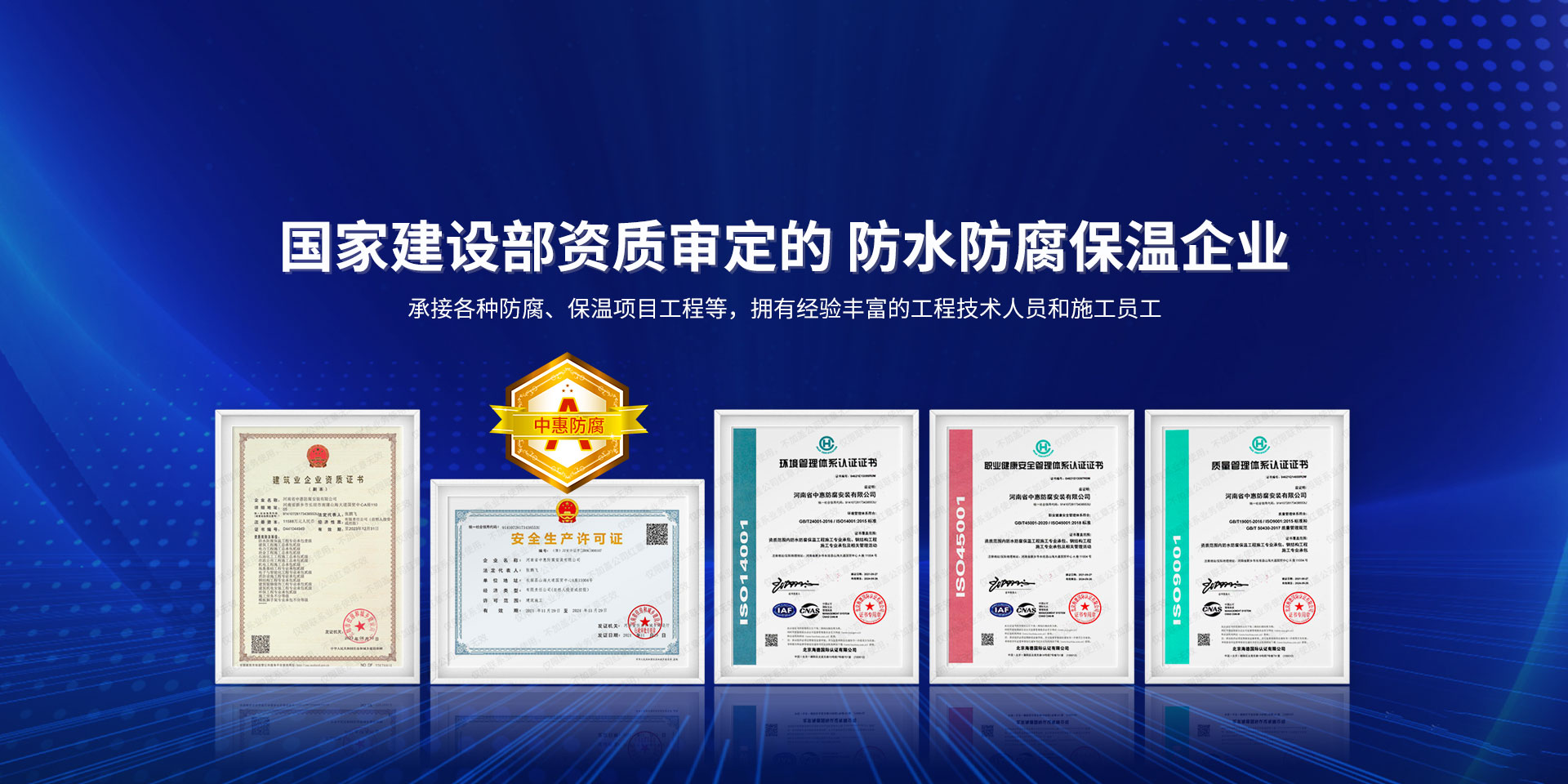 公司經營范圍:防水防腐保溫工程;消防設施工程;建筑裝修裝飾工程;建筑機電安裝工程;電力工程;建筑工程;石油化工工程;工業清洗工程;油罐清洗工程;鋼結構工程;環保工程;模板腳手架工程;電纜防火封堵、防污閃噴涂、外墻外保溫工程;各類施工勞務作業;設備維修、船舶鉚焊、涂裝;電力工程材料、建材、防水材料、防火材料、防腐保溫材料銷售,并相繼通過了GB/T19001-2008idtISO9001:2008GB/T50430-2007質量管理體系認證證書。GB/T24001-2004idtISO14001:2004環境管理體系認證證書。GB/T28001-2011idtOHSAS18001:2007職業健康安全管理體系認證證書。公司是中國防腐蝕于防護協會、中國施工企業管理協會、電力協會和中國鋼結構防水協會會員單位。 公司的經營業務涵蓋了石油、化工、電力、冶金、煤炭、船舶、國防、燃氣、水利、環保、交通運輸、航空及國防軍工和輕紡市政等行業的防腐保溫絕熱設備。鋼結構安裝、防火、防水、金屬噴鍍、聚脲噴繪、陰極保護、防滲透堵漏、玻璃鋼及各種磚版材料襯里、橡膠襯里、煙氣硫和耐酸溶劑腐蝕等工程施工。公司連續十年榮獲“省市先進施工企業”“安全生產先進單位”“重合同,守信用企業”和“AA***資質企業”的稱號。2000年被命名為市級文明單位,2002年被國家工商行政管理局命名為“重合同,守信用的企業”、被中國工業防腐蝕技術協會命名為“防腐蝕企業,能源節約及環境保護領域有豐富的經驗和***的業績。工程一次交驗合格率100%。其中攀枝花鋼鐵公司煉鐵廠四號高爐及熱風爐防腐工程、上海寶鋼公司煤氣柜防腐工程、撫順石油一廠裝置防腐項目、齊魯石化公司稀烴廠高塔防腐工程、吉林化學工業公司煉油廠油罐防腐工程、天津石化熱電廠六號爐頂棚聯絡管保溫工程、大慶油田(太倉)力神泵業工程、中國化學工程第十一建設工程、中原油田勘探局工程、中國石化銷售有限公司華北分部、魯皖輸油管道工程、貴州開磷息烽合成氨工程、陜西黃陵煤化工程、中國石油天然氣西部管道塔里木輸油工程、邯鋼集團邯寶鋼鐵公司煉鐵工程、德州供電工程、吉寶(南通)船廠工程,偃師華潤熱力工程、鄭州熱力總公司。 河南省中惠防腐安裝有限公司愿以豐富的施工經驗,***的技術,***的設備,***的管理,***的服務,竭誠為國內外廣大的用戶提供***滿意、******的工程作品。 我公司愿與國內外同仁一道,團結協作,共同推進防腐蝕行業發展! 公司地址:河南省長垣縣建設路北段360號 固定電話:0373-8866488 郵編:453400 網址:http://www_zhff_com_cn.yanliao0769.com